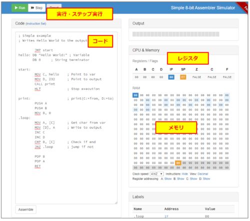 Simple 8-bit Assembler Simulatorを使ってアセンブラの動きを簡単に見てみます。