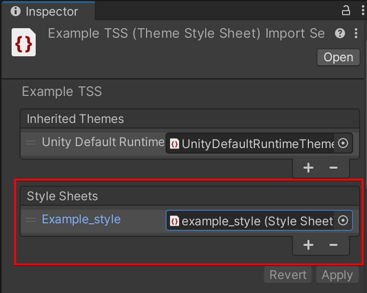 作成したらこのTSSファイルのInspectorから、Inherited Themesに前節のUnityDefaultRuntimeTheme.tssを追加してApplyします。