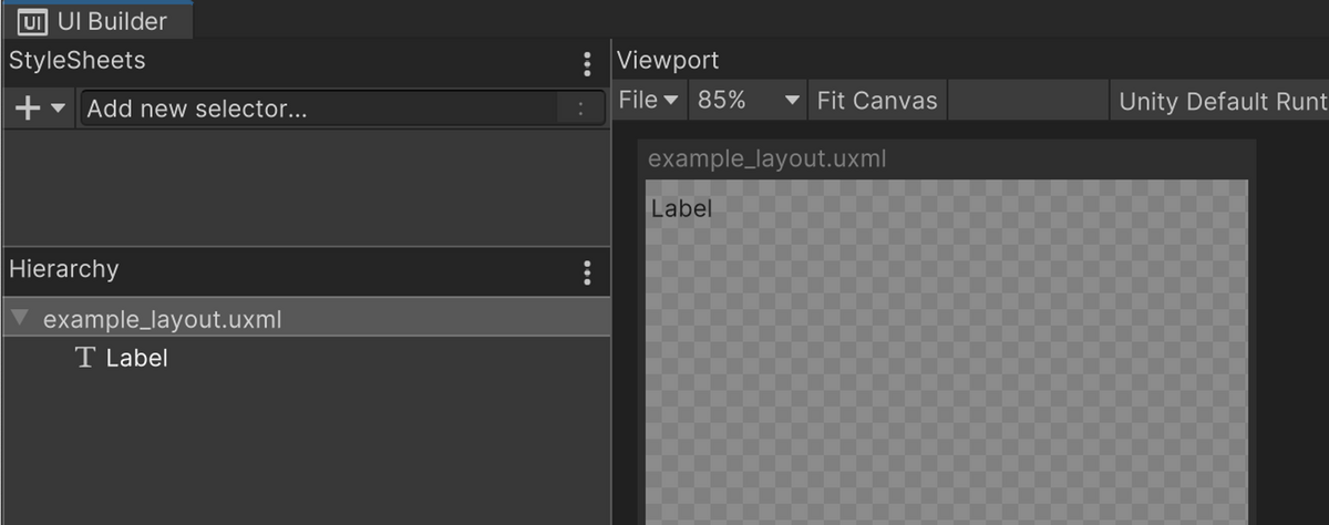 Create > UI Toolkit > UI Documentから新しくUXMLファイルを作成し、ダブルクリックしてUI Builderを開きます。