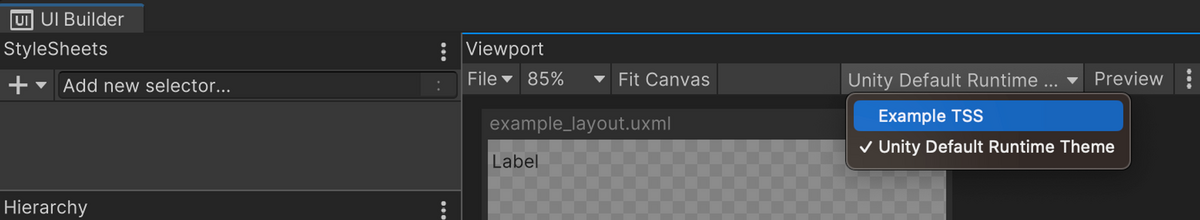 次に、UnityDefaultRuntimeThemeを継承したTSSを作成します。 TSSファイルはCreate > UI Toolkit > TSS Theme Fileから作成します。