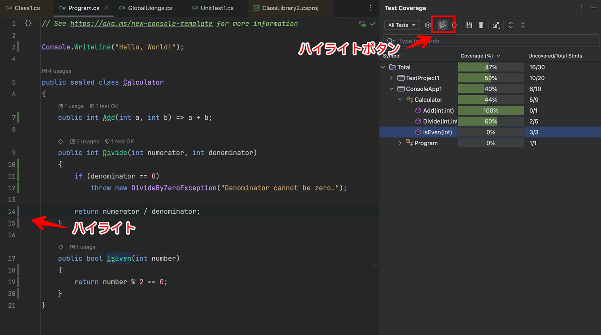 これを使うと Rider から簡単にコードカバレッジを計測・可視化することができます。